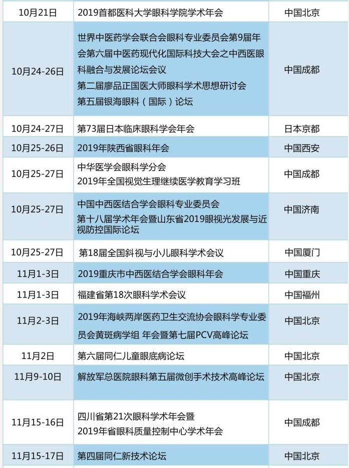 2019年较新较全国内外眼科会议一览表已出炉,从中华医学会眼科学分会举办的相关会议到欧美眼科学术会议皆有展示: