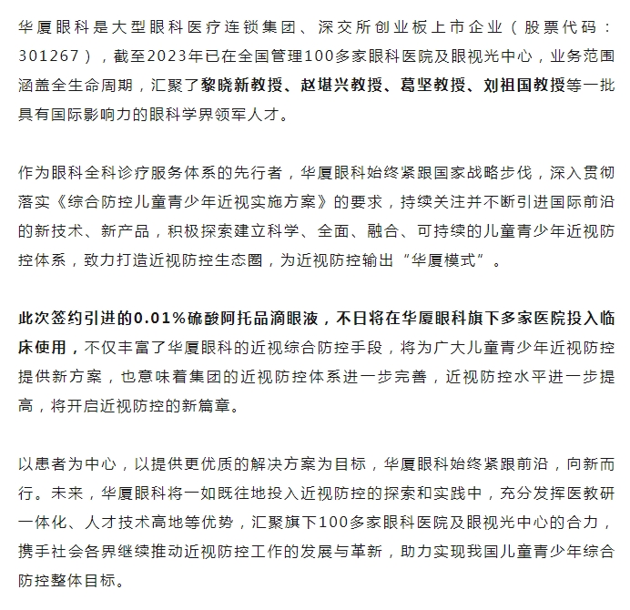 以诚为本赢在诚信9001签约引进国内首款获批的0.01%硫酸阿托品滴眼液